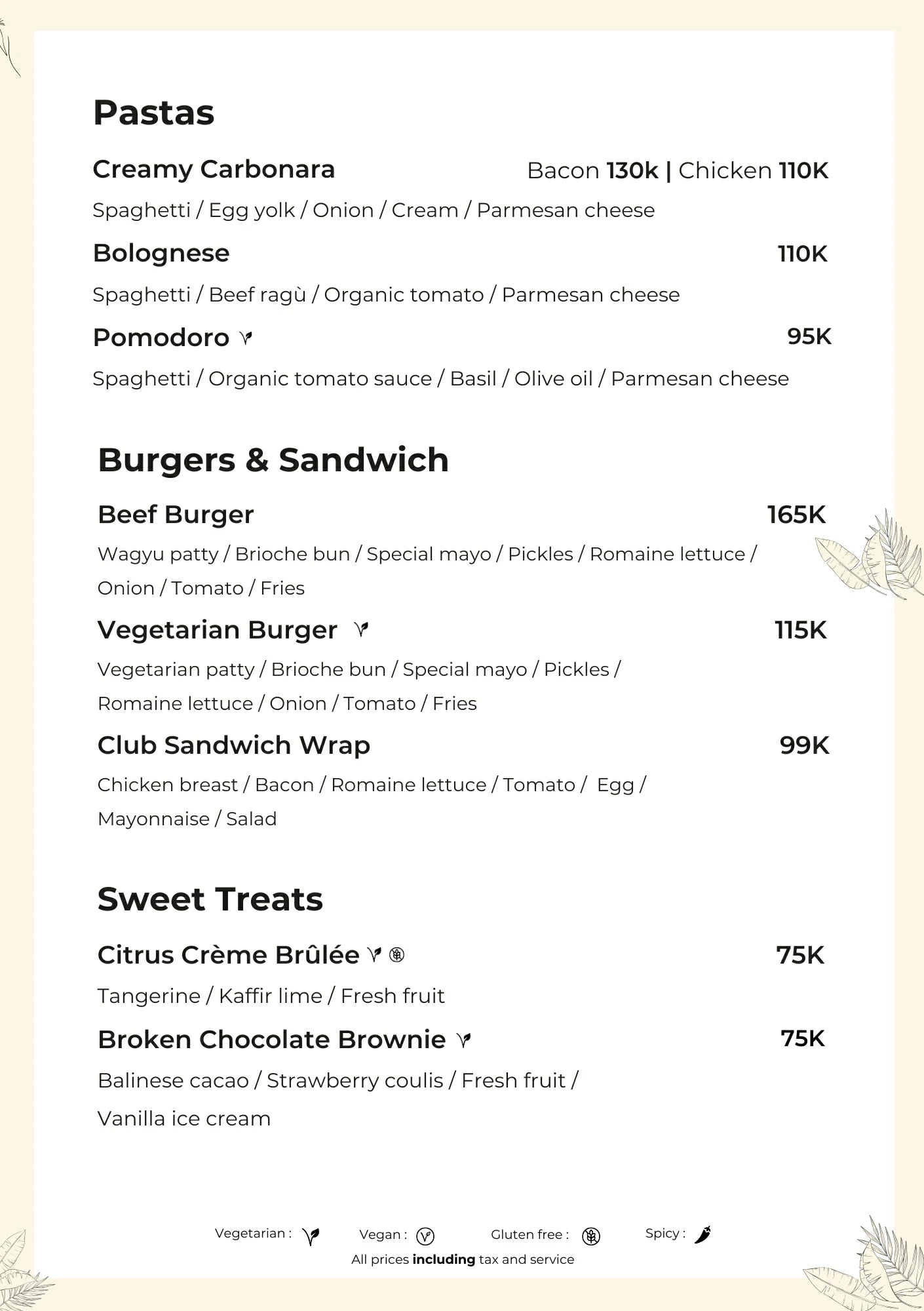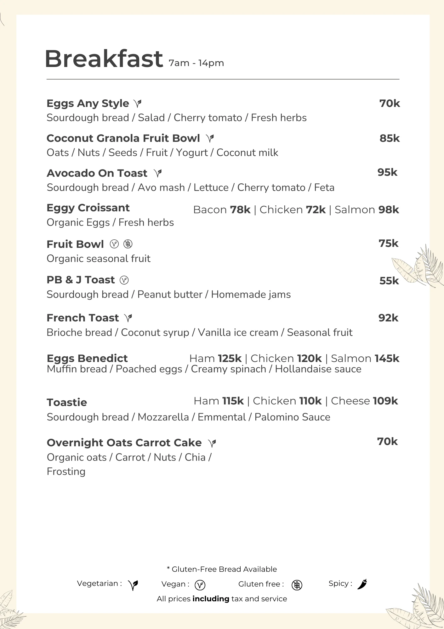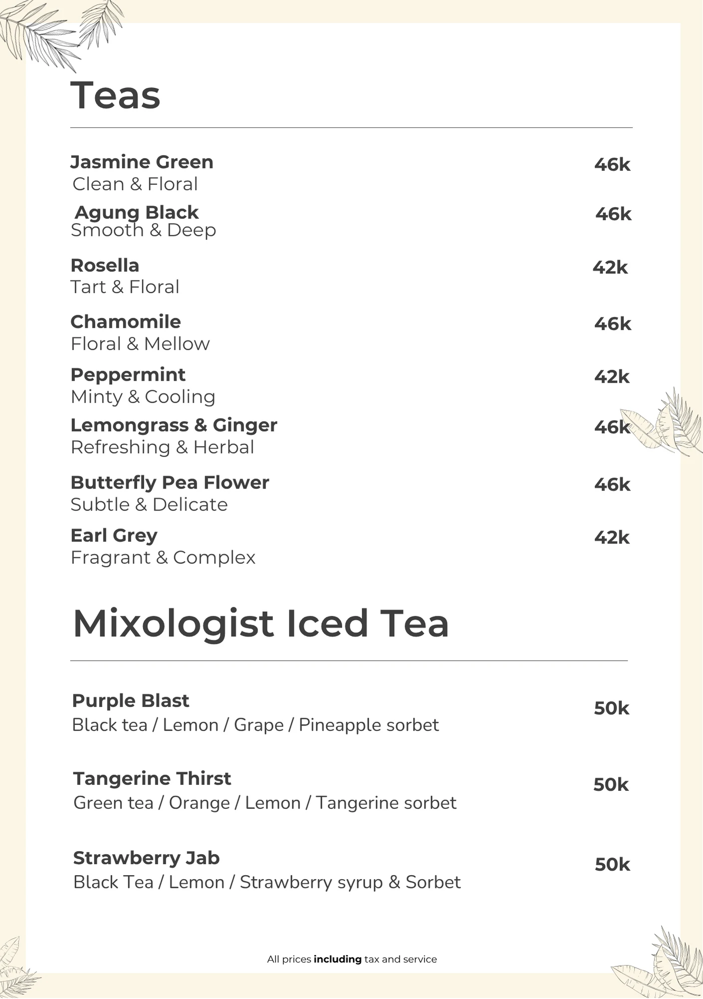 - Each guest is entitled to one main course, one juice, and one coffee or tea selection per person.